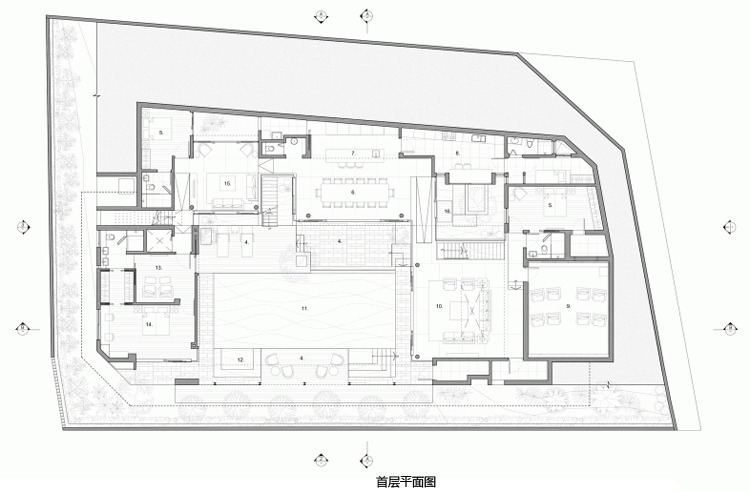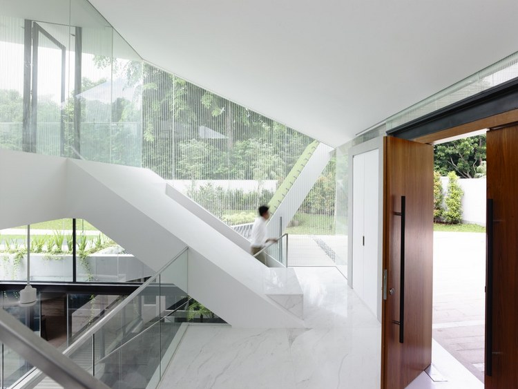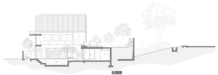 別墅設(shè)計(jì)安德魯路私人別墅(Andrew Road)設(shè)計(jì)師將與街面水平的這一層打造為封閉式的樣式,從入口處可以看到中央院落巨大的游泳池,四面各功能房采用了透明玻璃設(shè)計(jì),高于街面水平層的二三層樓的屋頂略大于房屋,如鍋蓋一樣將房屋罩在下面。長條式的格柵落地玻璃窗設(shè)計(jì)與其他部分的設(shè)計(jì)相呼應(yīng),體現(xiàn)了整個(gè)別墅簡明的風(fēng)格樣式。D字型的內(nèi)部空間設(shè)計(jì)將房間主要設(shè)置在半弧形的位置,過道和樓梯則位于D字形垂直的豎向位置,起到了隔離噪音等作用。