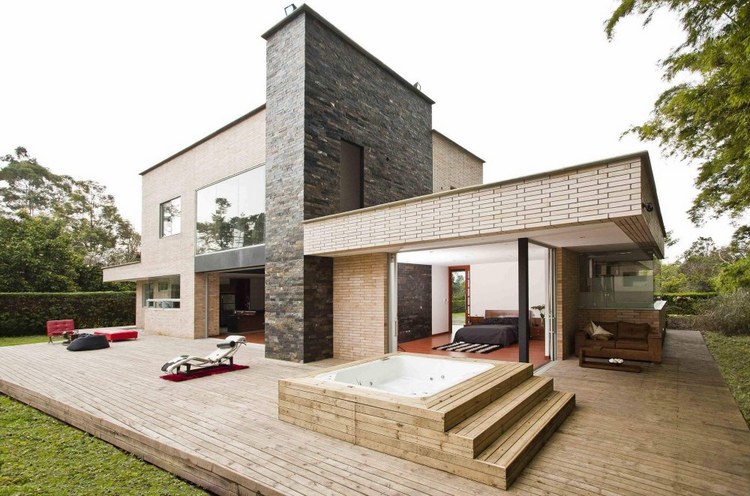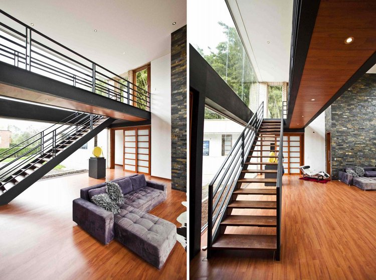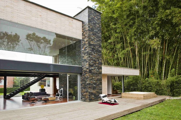別墅設計,Olaya別墅(Olaya House)Olaya別墅位于哥倫比亞Medellin市中心大概45分鐘的車程,房屋的首層采用統一樣式的磚塊鋪筑而成,但各功能分區布局規整、明確,包括服務區、活動區和私人區。服務區域包括車庫、傭人房、洗衣房和貯藏室。活動區內設有一個巨大的廚房并與用餐區和主客廳相對,通過一道甲板式通道便可來到院落。私人區有三個我是,每一個房間都帶有獨立衛生間、浴室和更衣室。活動區與私人區被一道巨大的黑色磚墻所隔開,不論從室內還是室外都可以看到這道墻,同時墻體也是房屋主結構之一,墻體內部設有一個公共于是和兩個獨立的煙囪,分別服務于主臥和主客廳的通風。經過位于一層服務區的風格化樓梯便可以來到二層:這里簡單舒適,分為兩個寬敞的區域,一個是書房一個是主臥,另外還設有兩個巨大的露臺陽臺,可以從這里欣賞外面的風景。值得一提的是,露臺與房屋由一座小橋連接。