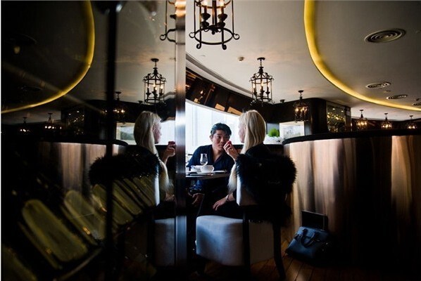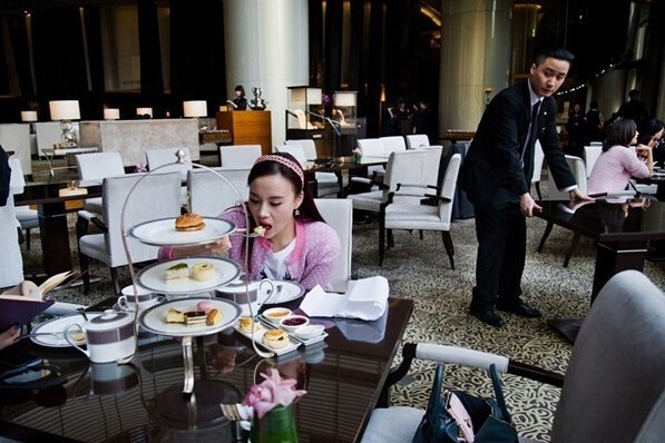 上海朗廷酒店,一名年輕的中國(guó)女孩在享用茶點(diǎn)。