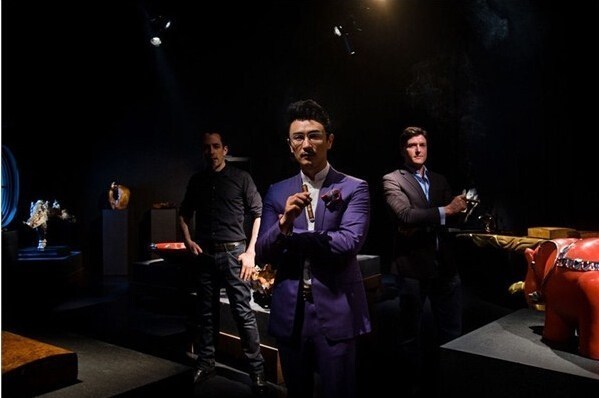 中國(guó)企業(yè)家塔羅斯(中)與他的兩名雇員——來自英國(guó)的托比·柯林斯(右)和來自美國(guó)的梅爾斯在工作室內(nèi)合影。