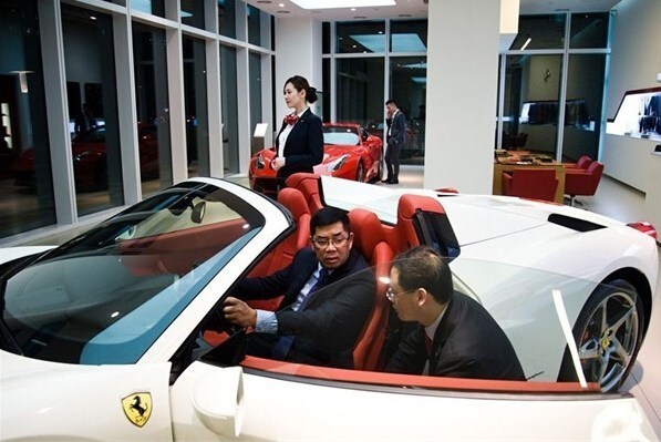 浦東世紀(jì)大道一間豪車展廳內(nèi),一位男士試駕報(bào)價(jià)450萬人民幣的法拉利458 Spider。